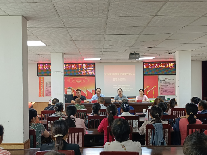5月16日,由忠县某技能培训学校联合县人力资源和社会保障局主办的医疗辅助护理技能培训结业典礼暨现场招聘会在金鸡镇举行。