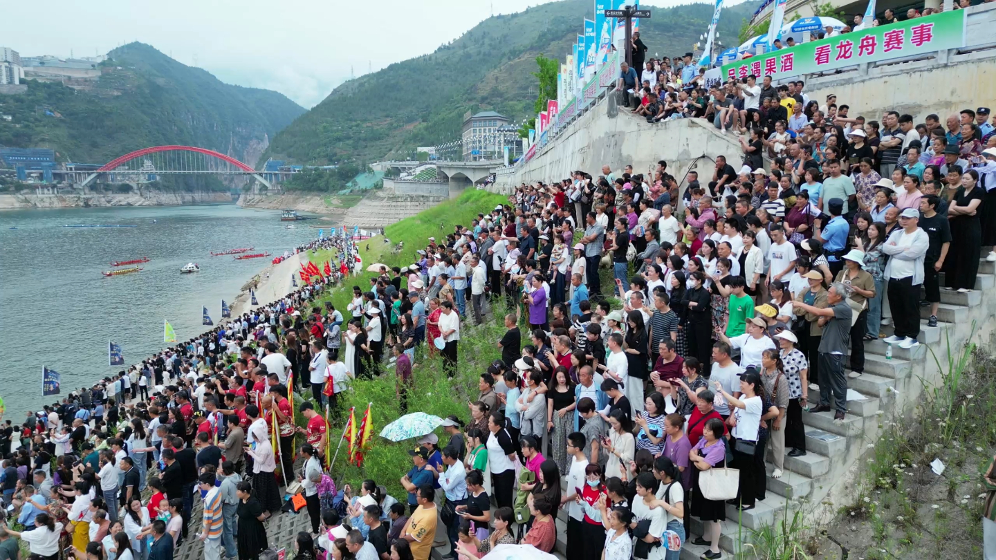 上午9时,发令枪响彻河谷。16艘龙舟如离弦之箭破浪而出,鼓点声、号子声与观众呐喊瞬间响彻上空——红漆木桨齐力翻飞,溅起银色水花;龙头高昂破风,船身似游龙穿梭。“加油!加油!”两岸观景台、堤坝上,观众挤得密不透风:老人举着蒲扇踮脚张望,孩童骑在父亲肩头挥舞小旗,年轻人举着手机全程录像,大宁河水面倒映着攒动的人潮与飞驰的龙舟,活脱脱一幅流动的“水岸狂欢图”。