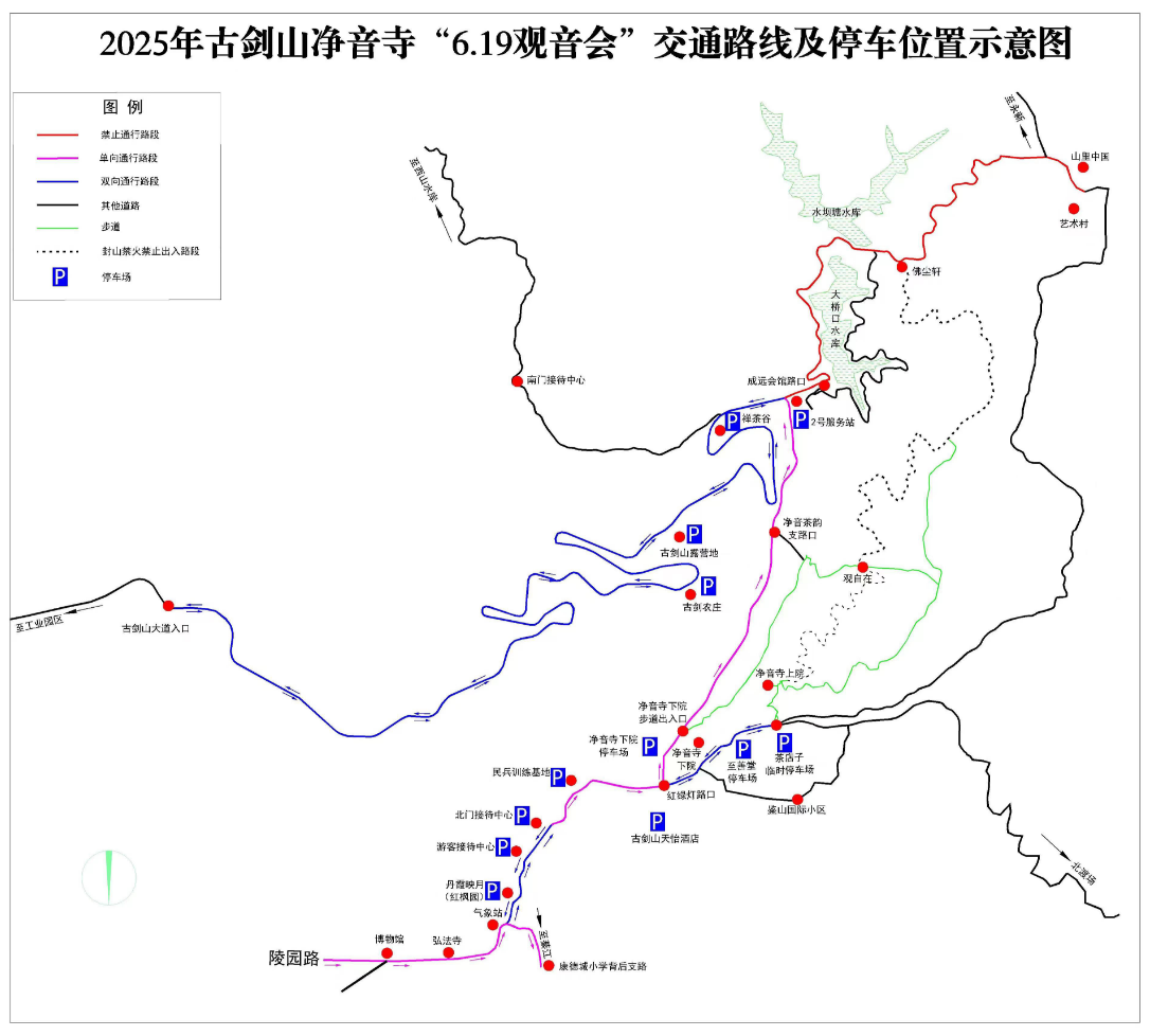 2025年“6・19观音会”期间,净音寺上院(鸡公嘴)、下院及邱家岩弘法寺正常开放。为保障活动期间道路交通秩序安全畅通,预防道路交通事故,根据《中华人民共和国道路交通安全法》相关规定,綦江区公安局交通巡逻警察支队将对古剑山景区道路实施交通管制。现将具体事项通告如下: