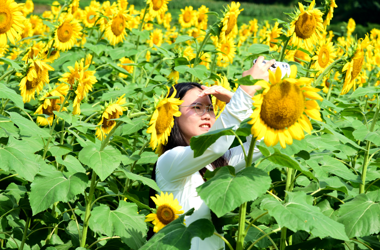 盛夏时节,打通镇吹角村的200余亩油用向日葵(简称油葵)迎来盛花期。金灿灿的花盘向阳绽放,汇成一片涌动的金色海洋,吸引众多游客慕名而来打卡、拍照。