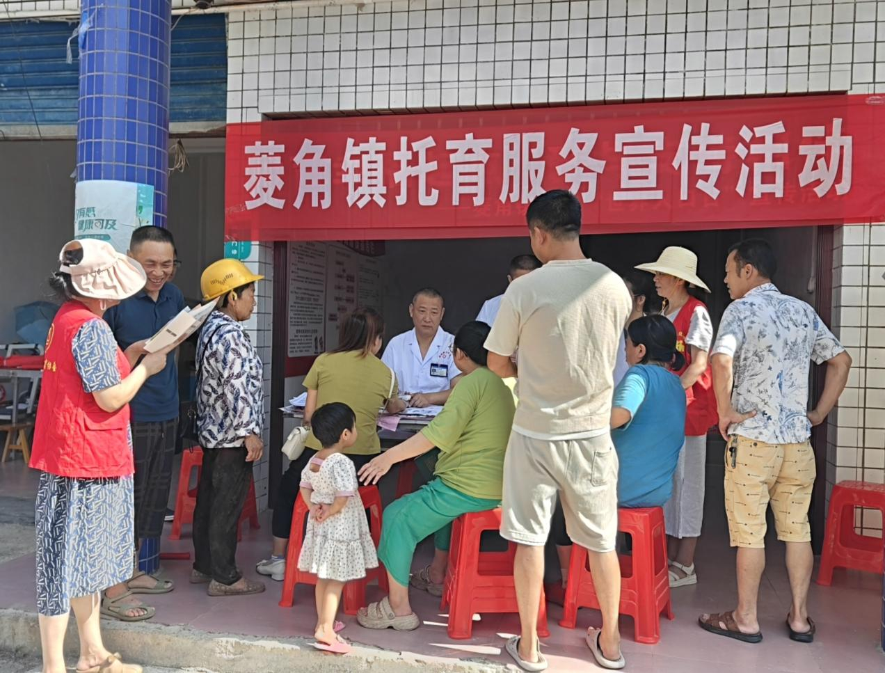 7月18日,菱角镇组织志愿者队伍开展托育服务主题宣传活动,以现场咨询、科普解读与政策宣导相结合的方式,向居民精准传递科学托育理念。