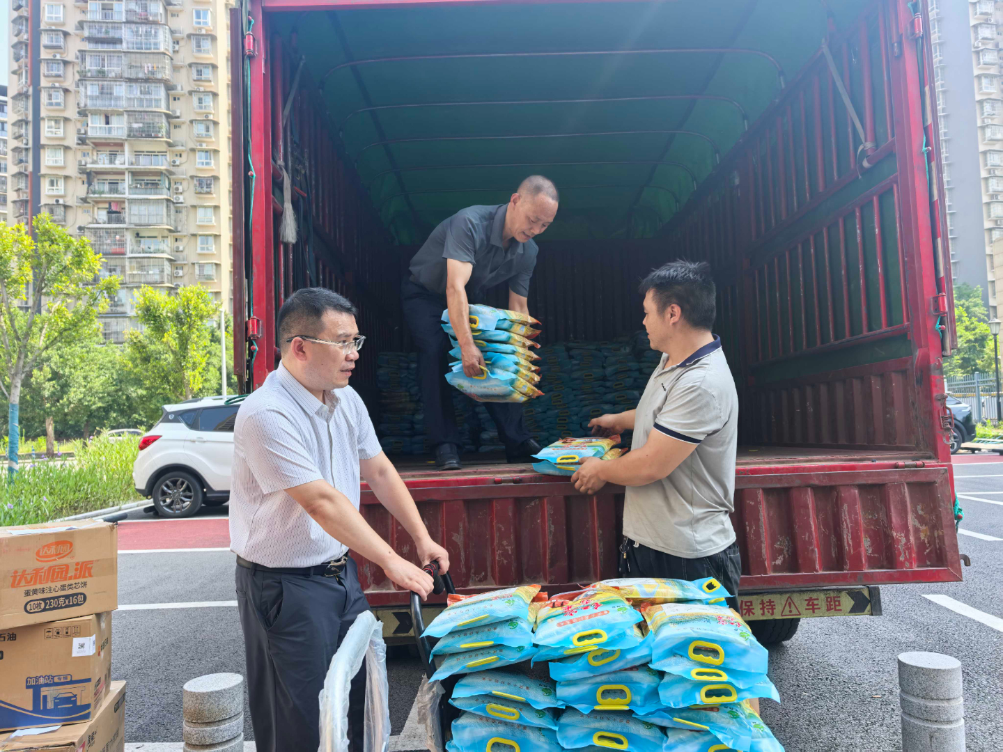 ▲工作人员将一包包香米快速装车。