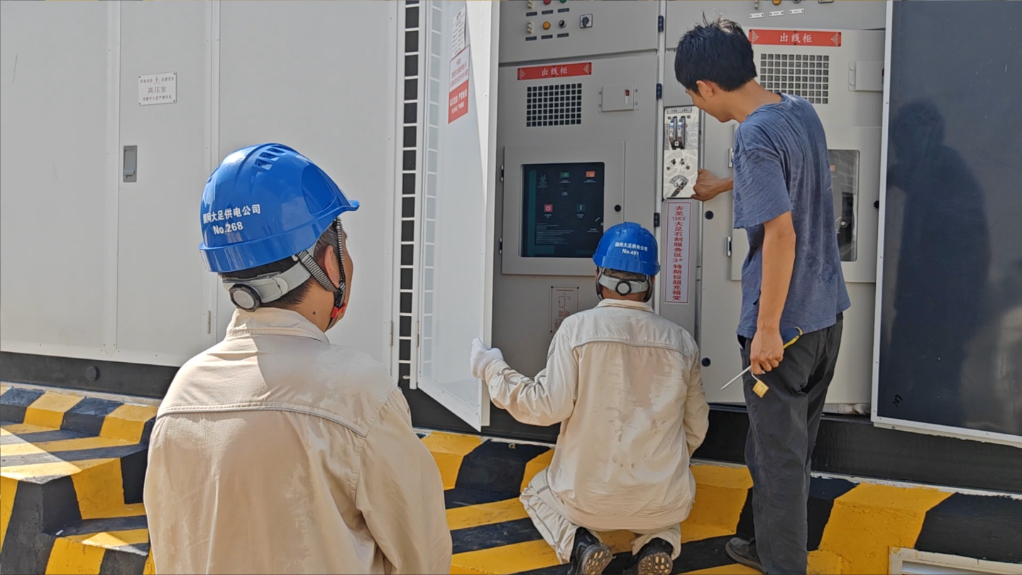 7月25日,国网重庆大足供电公司员工来到渝蓉高速大足石刻服务区,开展客户新建的重卡超充站通电投运工作。