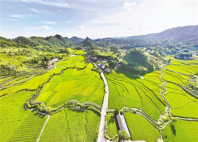 近日,梁平区蟠龙镇扈槽村,水稻陆续成熟,或青或黄的稻田与农房、道路、青山相映成趣,构成一幅美丽的画卷。