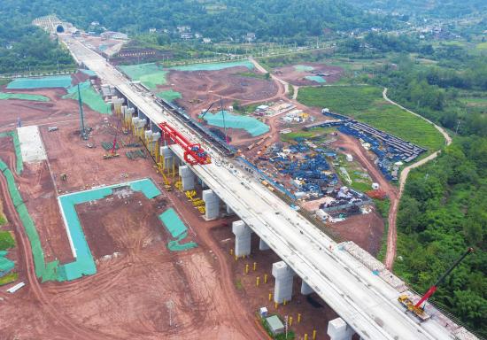 8月6日,成渝中线高铁大足石刻站四线道岔特大桥施工现场一片忙碌,桥梁上部施工与站房配套进入攻坚阶段。据了解,当前成渝中线高铁(大足段)全线已完成路基土石方开挖工作,大足石刻站站房施工单位已进场施工,同步开展站场土石方平整与地质勘探。成渝中线高铁是我国“八纵八横”高铁网沿江通道的重要组成部分,正线全长292公里,设计时速350公里。
