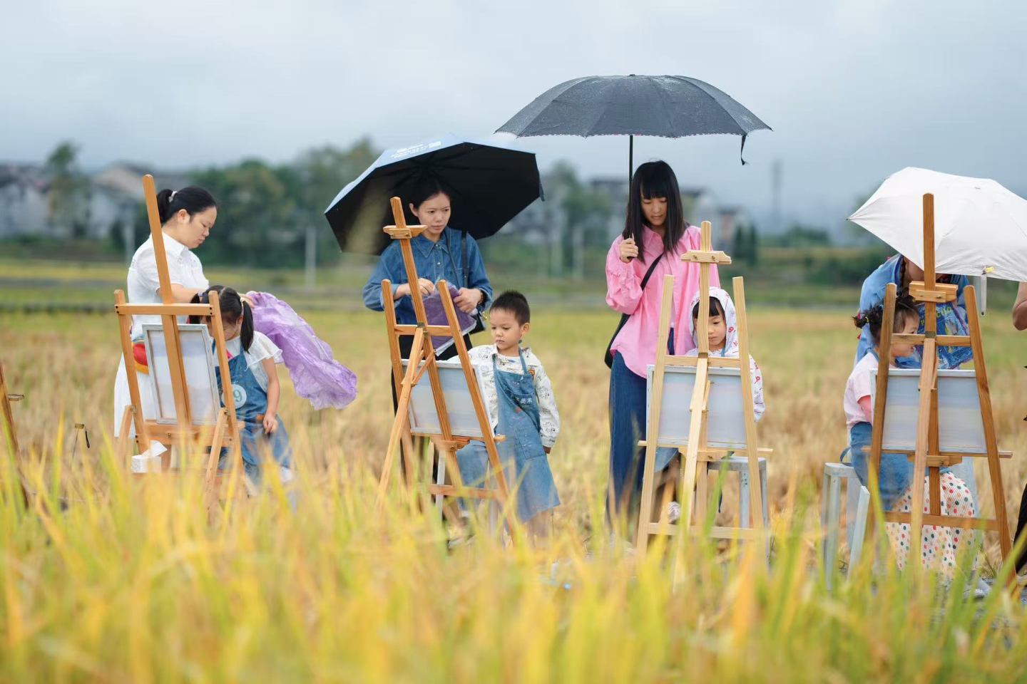 金秋九月是收获的季节,在清溪场街道龙凤花海的万亩粮田区,成熟的稻田就像金色海洋。活动中,孩子们与父母携手走进田间,在老师的悉心指导下,亲子协作、执笔共绘,完成了一幅幅生动的《边城的稻田》写生作品。