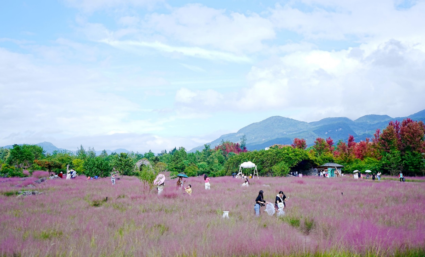 王海峰介绍,今年叠石粉黛乱子草抽穗率高,花期预计延长至10月下旬。景区在花海增设多处打卡点位,给游客预留了便利的打开道路,游客拍照,就像走在画里一样。