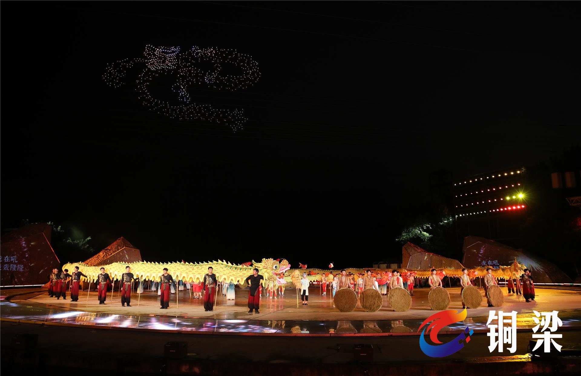 10月18日晚上8点,在玄天湖龙文化演艺中心内,大型非遗山水实景剧《追梦·铜梁龙》正火热上演。与此同时,1000架无人机以浩瀚夜空为舞台,与实景剧展开深度联动,通过“星河引鲤、鲤跃龙门、龙腾收官”三幕精彩大戏,为现场观众带来了一场无与伦比的视觉冲击。
