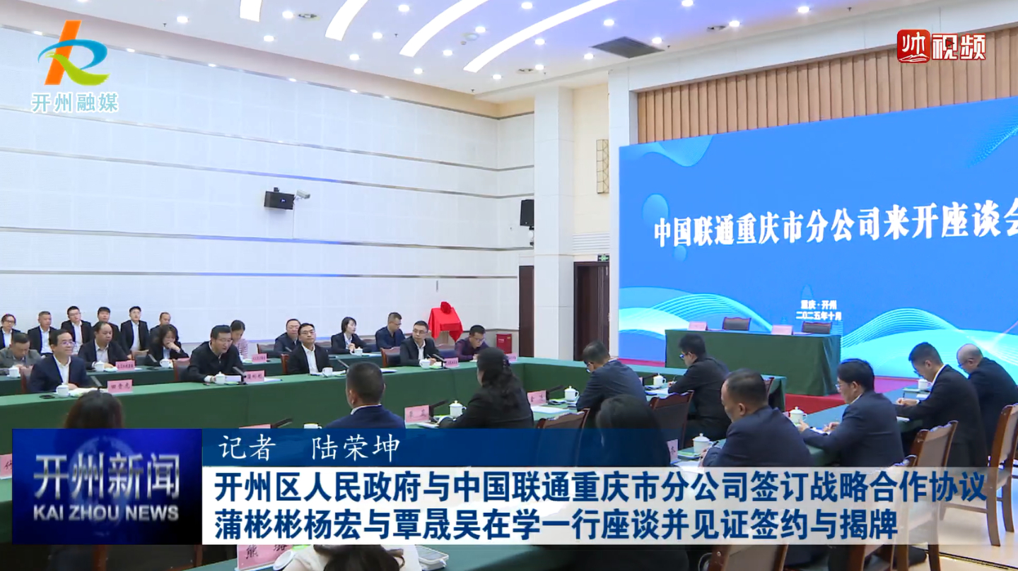 10月22日,开州区人民政府与中国联通重庆市分公司签订战略合作协议,并举行乡村振兴(重庆)数字产业研究院渝东北分院揭牌活动。区委书记蒲彬彬,区委副书记、区长杨宏与中国联通重庆市分公司党委书记、总经理覃晟,乡村振兴(重庆)数字产业研究院董事长吴在学一行座谈并见证签约与揭牌。