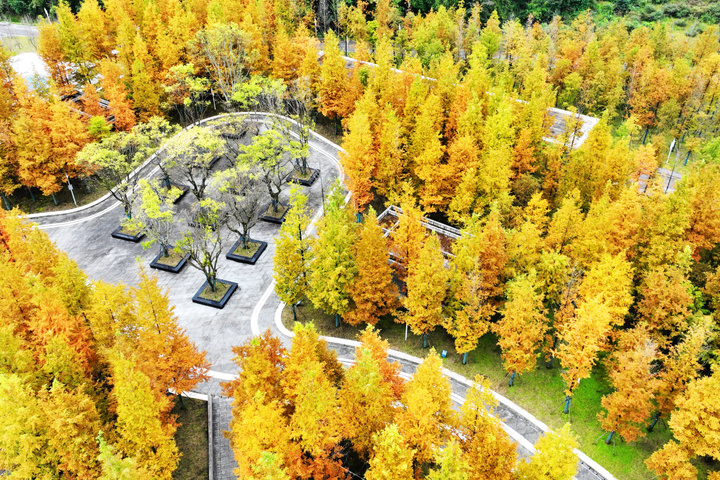 走进口袋公园,首先映入眼帘的是一片五彩斑斓的树林。火红的水杉树叶、斑斓的乌桕,相互交织在一起,构成了一幅绚丽多彩的画卷。