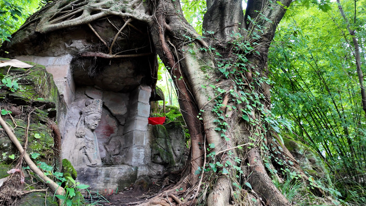 在大足区宝顶镇香山社区杨家坡,可见一株巨大的黄桷树,其根系沿着刻有造像的巨石自然蔓延,在石刻造像周身形成天然“铠甲”。被包裹的半身佛像头戴卷草莲花冠,手执长梗莲花,衣襟间的璎珞纹饰依稀可辨,尽显宋代造像的典雅庄重。据考证,这尊石刻是南宋高僧赵智凤主持营建宝顶山石刻时,规划的“四方结界”造像群之一。作为密教道场的外围守护造像,它与宝顶山核心景区造像同属宋代规划设计,是16处周边宋代造像点的重要组成,对研究石窟群性质具有重要价值。当年工匠凿刻的三身造像,如今仅存这尊右侧半身像。而黄桷树,则是50多年前,附近村民龙运富所栽植。