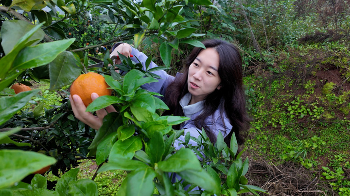 桔香果园负责人谢雪晴介绍:“眼下咱们500多亩爱媛果冻橙正迎来丰收,依靠科学管护和有机肥培育,实现了果皮薄、果肉细腻、汁水饱满的好品质。果园里还种植有糖橘、耙耙柑、明日见、沃柑等品种的柑橘,采摘期能从现在持续到明年4月。”