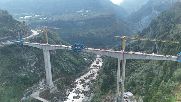 据了解,栗子龙河特大桥为预应力混凝土连续刚构特大桥,是栗子湾项目核心节点工程。桥梁采用“93米边跨+155米主跨+93米边跨”的连续刚构设计,主墩高达81米,最大桩基直径2.8米、深度52米,施工过程中需攻克高墩大跨度悬臂浇筑等多项技术难题。自开工建设以来,项目团队不断细化施工节点,积极探索工艺优化路径。目前,桥梁中跨已顺利合龙,标志着项目建设取得突破性进展,为后续工程推进奠定坚实基础。