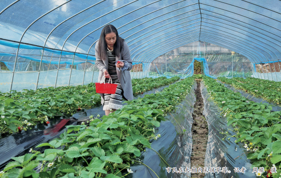 走进农场大棚,一股清甜的果香扑面而来。不少游客手提篮筐,俯身挑选着心仪的果实。“这草莓不仅颜色鲜、味道甜,自己动手摘下来,更新鲜有趣!”游客王孝连对这里的草莓赞不绝口。同样是草莓爱好者的游客陈霞已是多次到访,她说:“我是常客了,对这里的草莓品质十分认可。”