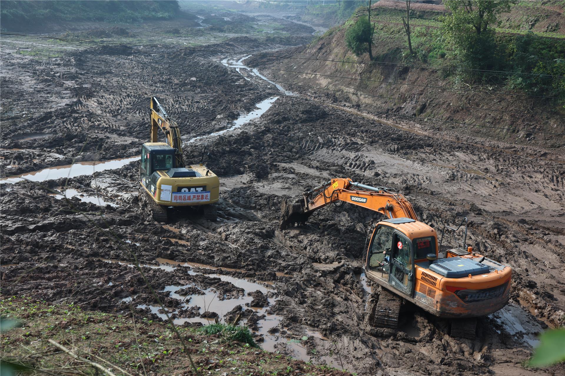 日前,在铜梁区太平镇铁鹅村、双福村的高标准农田建设现场,挖掘机正忙着进行土地整治作业,泥土地块间已初见规整轮廓。