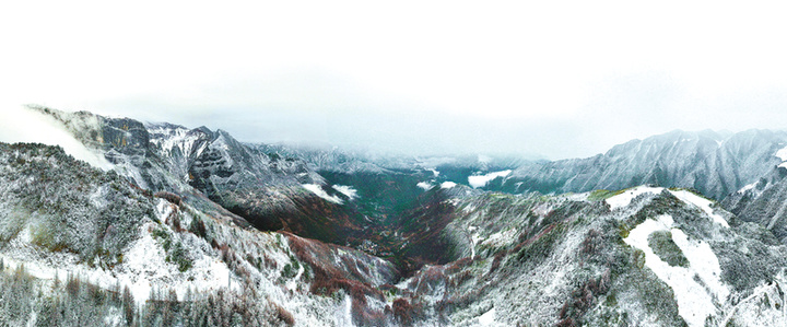 从12月20日凌晨开始,雪宝山国家级自然保护区海拔1500米以上的区域开始飘落雪花,至清晨时分,近处的山坡、林梢铺满积雪,银装素裹,美不胜收。远处的群山则是半青半白的景致,苍翠底色间点缀着斑驳白雪,勾勒出一幅层次分明的冬日画卷。