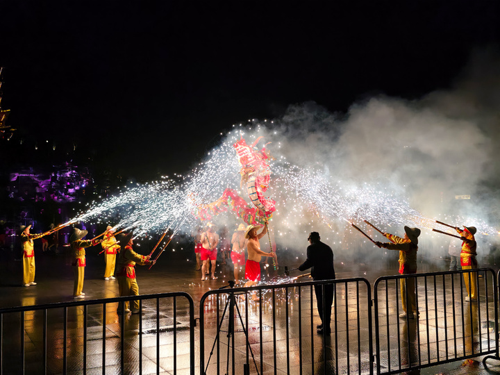 与此同时,“昌州夜宴·元启新春”2026大足双节嘉年华活动也在火热进行。当晚,升级呈现的《一念大足》水秀成为一大亮点,演出融合非遗打铁花技艺。炽烈的火光在夜空中绽放,如流星般划过,与水秀相互映衬,生动演绎石刻故事,美轮美奂的场景引得观众阵阵惊叹。除了特色演出,新年游园活动同样精彩。活动通过场景营造、民俗互动、宋服巡游派福等形式,打造沉浸式文化体验。游客们穿梭其中,参与民俗游戏,感受传统文化的魅力。