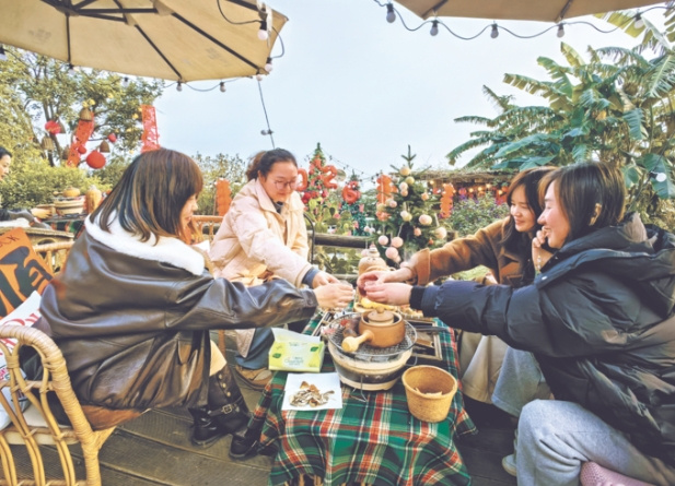 开业至今,“江上云栖”凭借独树一帜的雅致格调,已接待上万名慕名而来的游客。这里以“围炉煮茶”为核心特色,搭配定制款精致轻食简餐,成为朋友小聚、公司团建的热门首选地,每到周末与节假日,更是早早满座,一桌难求。张静直言:“我们不贪多求全,就专注围炉煮茶这一件事,把氛围和体验做到极致。”也正因这份独特,这里成了金鳌山上小有名气的取景地,婚纱照、品牌广告片接连慕名而来。