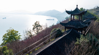 从空中俯瞰,一株株红梅依山而立,密密匝匝的花蕾缀满枝头,有的已然舒展花瓣,迎风俏立;有的仍含苞待放,透着几分羞涩。放眼望去,红梅花开成片,江面碧波如镜,亭台楼阁,镶嵌其中,浑然天成。