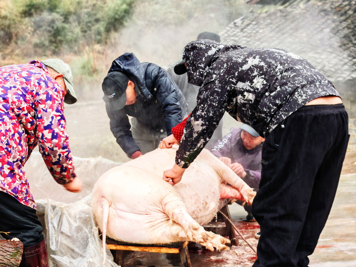村民对刚宰杀的猪进行刮洗。吴俊飞摄