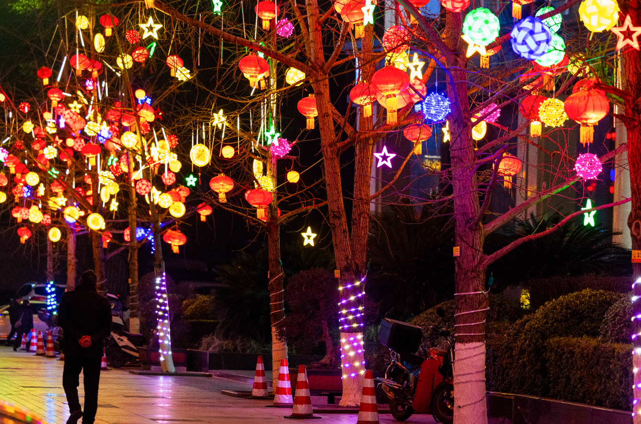 ▲一盏盏彩灯、一串串灯笼将城市街巷装扮得流光溢彩。记者 陈星宇 摄