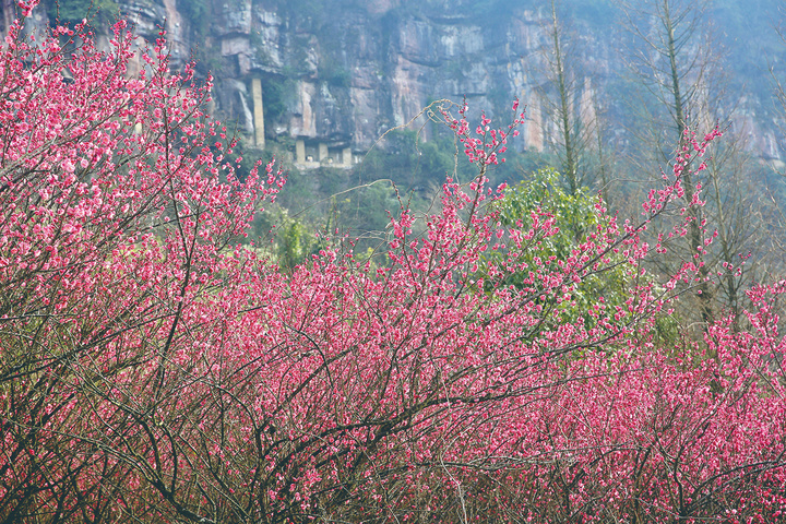 在古剑山旅游度假区赏梅区域,近千株红梅错落分布在山间,或含苞待放,或傲然盛开,粉嫩的花瓣在微风中轻轻摇曳,与远处的山峦和蜿蜒的步道相映成趣。空气中弥漫着淡淡的梅香,引得蜜蜂穿梭其间。