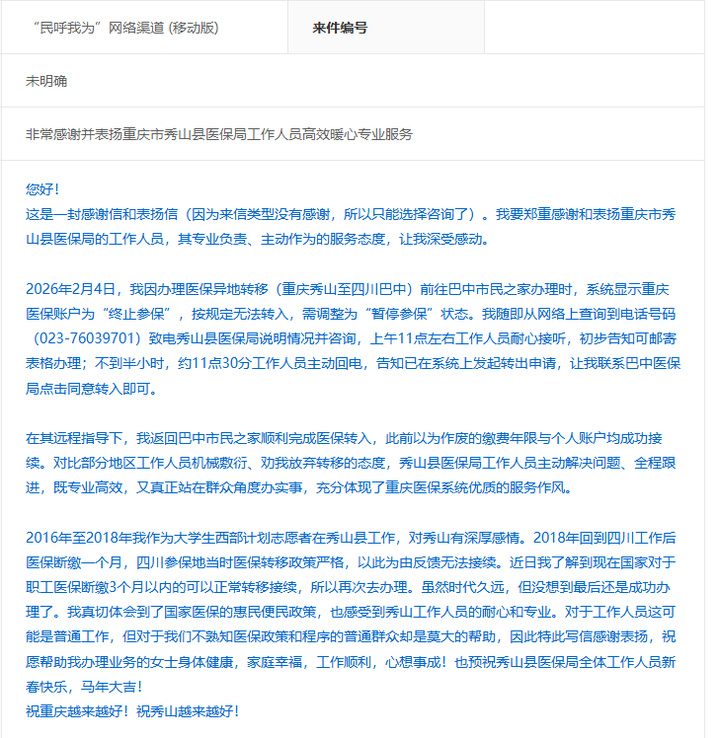 翠翠秀山客户端讯 近日,县医保局收到一封通过“民呼我为”平台的特殊来信。信中,参保群众闫女士对秀山医保工作人员耐心高效办理医保关系跨省转移接续业务致以诚挚谢意,字里行间充满了感动与认可。