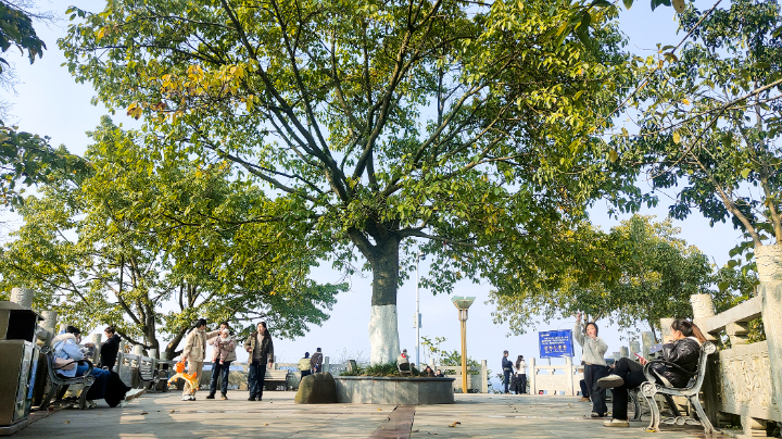 登高远眺,大足城区全景在晴空下徐徐铺展,错落建筑与葱茏绿意交织成宜居画卷。南山公园休闲平台上,市民或闲坐畅谈,或拍照定格美好,尽享晴日惬意。