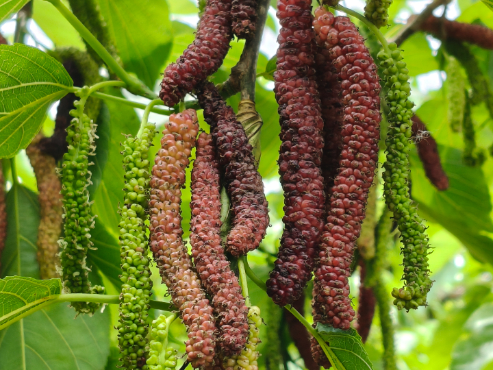 眼下正是桑葚采摘的时节,在东溪镇永华村陶家山,满目紫红,硕果累累。一颗颗心形或长条形桑葚挂满枝头。游客们拎着篮子,穿梭林间,小心翼翼地将那些藏匿在绿叶间的“紫珍珠”摘下,体验“现摘现吃”的快乐。