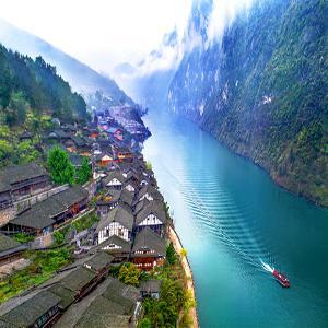 华龙网-新重庆客户端记者一行从龚滩古镇码头上船。只见,乌江画廊山似斧劈,墨绿色的乌江曲折于峭壁间;岸上的古镇吊脚楼鳞次栉比。
