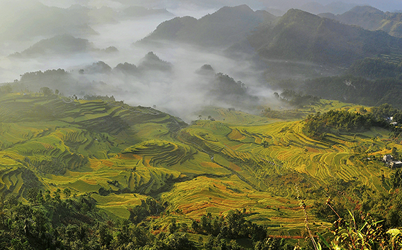 从高处眺望,万亩梯田云蒸雾绕,密密麻麻的曲线顺山势起伏延伸。一块块田地,或长或短,或宽或窄,大者不盈一亩,小者状如簸箕,层层叠叠,如天梯凌空。