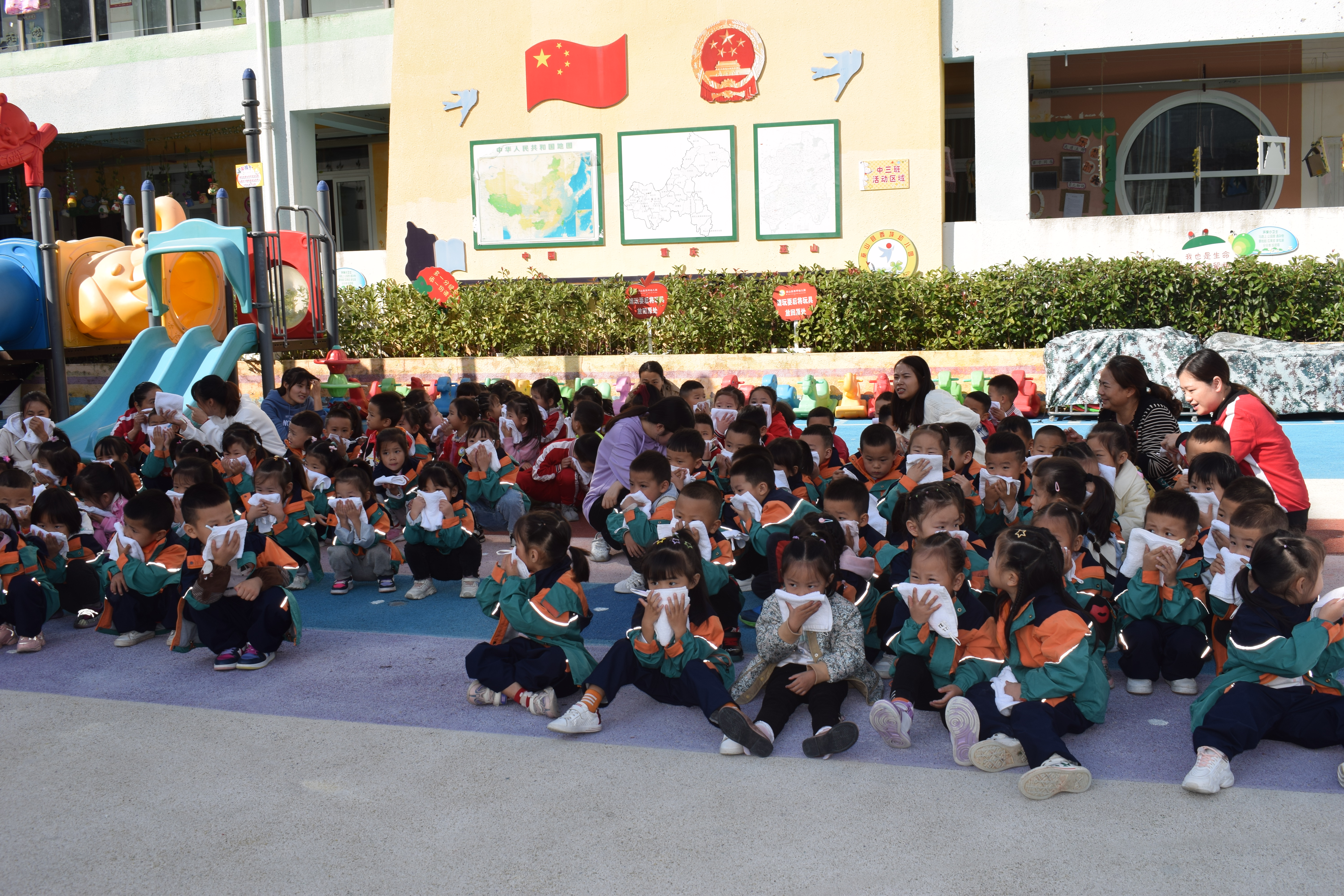 活动现场,随着消防警报的响起,各班教师迅速到达指定位置,避开起火点,从就近疏散通道带领幼儿们用湿毛巾捂住口鼻、弯下身体,迅速、有序地疏散到操场,整个疏散过程用时不到三分钟。
