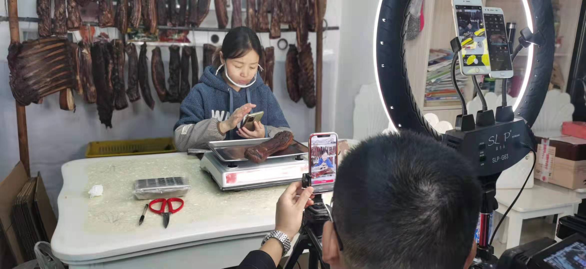 在位于赵家坝君瑞广场的居民楼里,记者看到正在网络直播的馨曦电子商务有限公司徐勇张玉芬夫妇。张玉芬一边与网友们进行热情互动,一边认真地切着腊肉,同时一旁的丈夫帮她拿货,下订单。张玉芬告诉记者,这种夫妻分工合作的工作模式已成为常态,男主外女主内,每天晚上的8点开始直播,直播时间为3个小时。第二天一早他俩就忙着打包发货。本该5个人做的事,两夫妻却全包了。