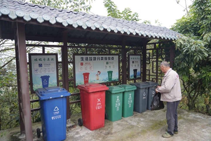 三合街道童仙寨社区党支部书记秦宗祥:“我们村上有3个垃圾分类点,设施设备都齐全,第二我们根据院坝会、入户宣传等,培训垃圾分类知识,现状上,农户都知晓垃圾是怎么分类,是怎么投放,现在农户就是按照我们培训的和他们自己的要求,和我们垃圾分类点的要求等,来投放这些垃圾。”