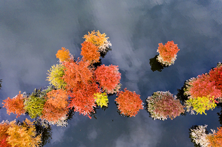 初冬的长寿湖水位上升,碧波荡漾。沿岸,一丛丛红杉静静地伫立水中,宛如一朵朵盛开的红花。特约记者 李