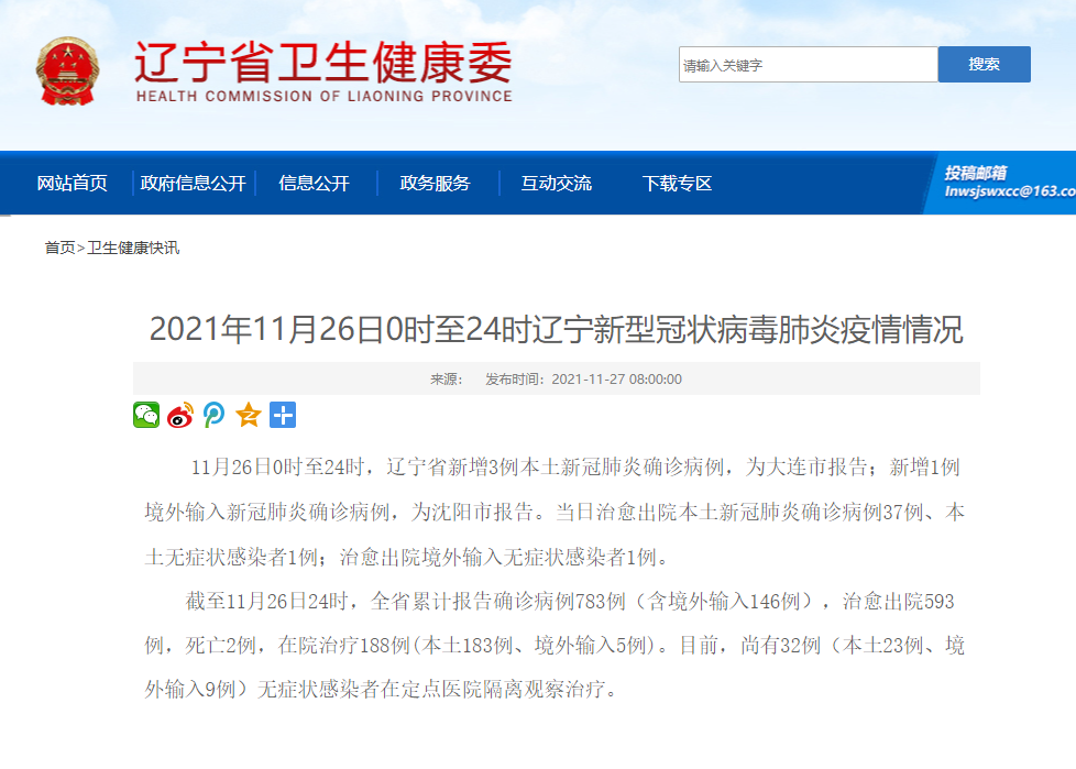 原标题:2021年11月26日0时至24时辽宁新型冠状病毒肺炎疫情情况