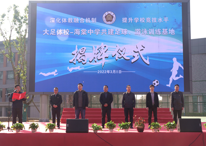 华龙网-新重庆客户端3月10日14时21分讯(通讯员 吴秋霜)3月8日上午,大足体校—海棠中学共建足球、游泳训练基地揭牌仪式在大足海棠中学举行。大足区教育委员会主任石朝勇,大足区体育局局长陈奇林,大足区体育发展中心主任邓廷建,区教委、区体育局相关科室负责人,海棠中学全体师生参加仪式。海棠中学校长杨太华主持仪式,教育、体育部门主要领导共同为训练基地揭牌。
