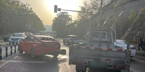 经过询问,民警得知,事发时,小货车驾驶员郭某开车行驶到高龙大道含谷小学路口,刺眼的阳光透过挡风玻璃迎面照来,顿时模糊了郭某的视线。结果,郭某没有发现前方已经停下来正在等信号灯的红色小轿车,“根本来不及踩刹车”,导致小货车直接撞了上去。