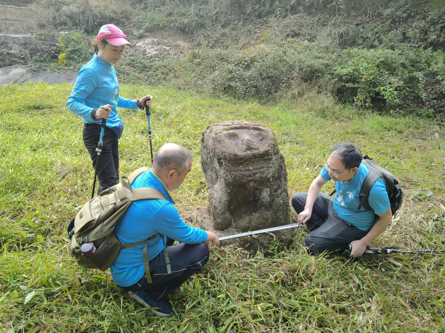 文史爱好者测量侧头“人面狮身”。通讯员 杏胡 摄