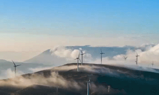 云南大理白族自治州洱源县罗坪山风电场项目,位于大理州洱源县茈碧、凤羽、炼铁、乔后四乡镇交接地,平均海拔3400米,属于云南省风力资源较好区域。近日,一台台高大的风力发电机组耸立在高山之上,云海翻腾、风车转动,宛若人间仙境。