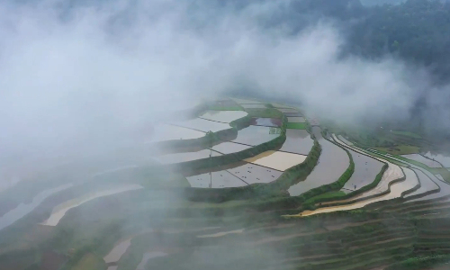 初夏时节,在贵州省黔东南苗族侗族自治州丹寨县,雨后的高要梯田云雾缭绕。苗寨和梯田在云雾中勾画出优美的线条,景色如画,美不胜收。高要,苗语的意思是山坡居住的部落。高要梯田从山顶一直绵延至山脚,上下落差近500米,是一处壮美的人文景观。