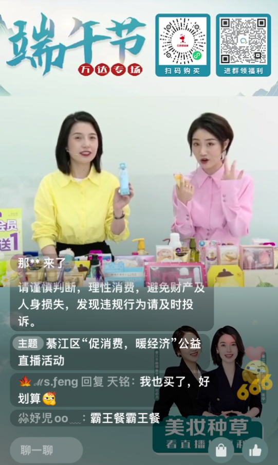 “上链接、上链接”“买好了,好划算”“雅漾喷雾是买二送一吗?小瓶装还送不送?”……6月5日14:18分,綦江区“促消费·暖经济”公益直播美妆专场准时上线。