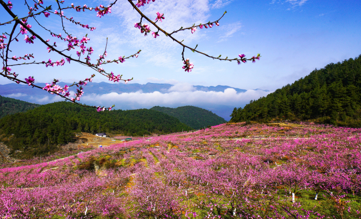 山磴坡这个曾经的乱石岗,如今是千亩桃树覆盖山坡。村支两委又结合实际,在此修建了观景平台,在这里除了观赏盛开的桃花,还可眺望连绵起伏的青山,拥抱大自然,给人一种“一览众山小”的感觉,整个身心都轻松愉悦。