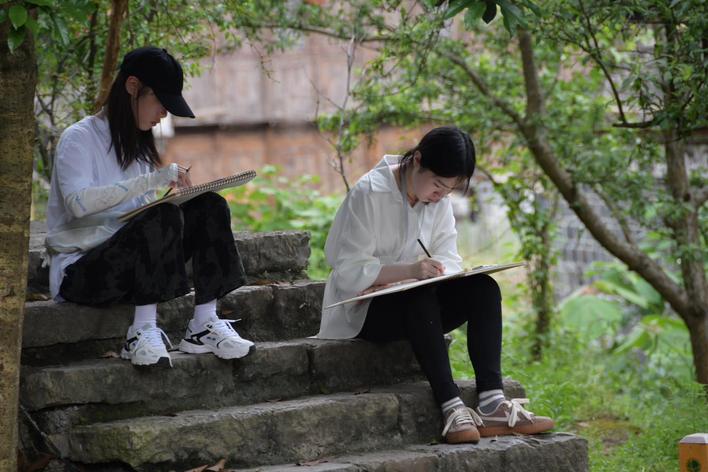 在古镇石板街、河堤旁,随处可见创作的身影。青砖黛瓦、吊脚悬楼、高山碧水在画笔下更显得五彩斑斓,而凝神创作的师生们,也成为古镇的一道靓丽的风景。