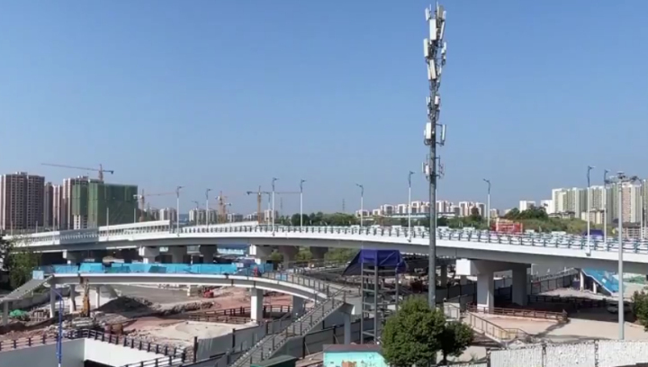 目前,该项目正在抓紧施工,人行天桥在进行电梯安装调试,平层推进景观打造,整个工程计划在今年8月中旬投入使用。