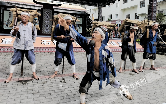 在这里同时上演的,还有石柱非遗文化展演,盐工号子、土家舞牛、民间吹打、土家摆手舞、洛尔调等表演,为非遗集市攒足了“戏份”。