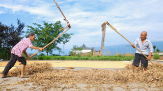 “打连盖”是一种巧活,通常由两人相对而打,利用惯性使黄荆条做成的木块旋转击打铺在地上的颗粒类农作物。双方“啪!啪!啪!”的敲打声一下接一下,不急不缓,踏实而有节奏。这正是:
