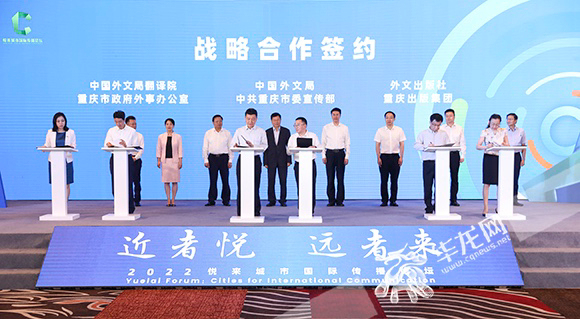 在开幕式上,中国外文局与重庆市委宣传部共同签署战略合作协议,中国外文局翻译院与重庆市政府外办共同签署战略合作框架协议,外文出版社与重庆出版集团共同签署战略合作协议。