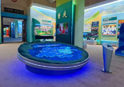 沙盘采用数字多媒体互动技术,呈斜向圆盘型,直径3.39米,主要由山脉地形、高清LED电子屏和外挂机械臂构成,大屏展示双城经济圈的核心内容,外挂机械臂配合透明小屏播放成渝地区双城经济圈宣传片,还设置了查询交互功能。