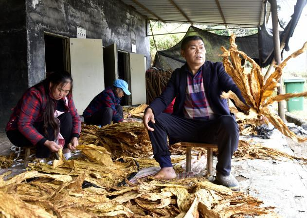 楠木乡红庄村7组小茶园的山坡上,矗立着两间烤烟棚,村民杨光辉、冉樊娥、冉琴等七八个人,一字排开坐在烤烟棚的木凳上,手里不停地摆弄着金黄色烤烟叶,进行分级扎把。